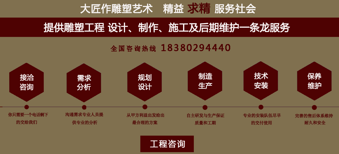 成都大匠作雕塑有限公司,是經成都工商局審定注冊的正規(guī)專業(yè)雕塑制作及工程安裝服務機構,是由一群年輕富有朝氣的年輕人創(chuàng)辦,發(fā)軔于四川省成都市龍泉驛區(qū)。它是一家******于創(chuàng)作、制作和銷售為一體的公司。大匠作擁有多年從事公共藝術的專業(yè)人員和雕塑制作人組成的核心團隊,為您提供專業(yè)、具創(chuàng)新的設計及制作服務。公司成立以來,秉承“******服務、誠信為本”的宗旨,以客戶需求為目標導向,不斷學習,進取,優(yōu)化和提高服務質量,公司向您******——“您的滿意***是我們的信譽”,我們將以飽滿的熱情和******的服務贏得您的贊譽和支持。